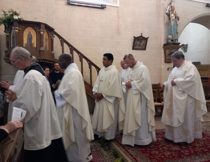 Puis la procession jusqu’à l’église s’est élancée avec en tête le père Joël Rignault administrateur du diocèse, le père Zacharie Niyonzima, en service sur la paroisse, le père Thierry Debacker d'Auxerre, le père Ernst Julien de Courtenay, frère Louis de la Famille Missionnaire de N-D de Sens et les servants d’autels venus en groupe depuis Auxerre.