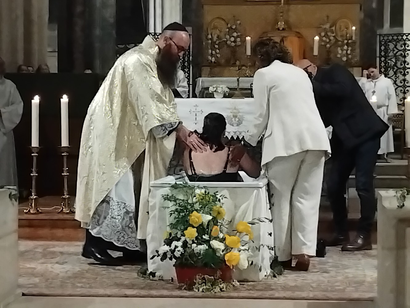 En effet, entourés d'une assistance nombreuse, c'est bien dans l'eau du baptême que les deux catéchumènes ont été totalement plongés par le Père Romain dont la joie était à l'unisson de celle d'Angèle et de Clément.