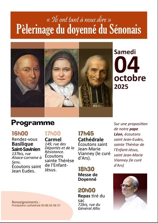 - "Ils ont tant à nous dire" Inspirés par notre pape Léon, allons à Sens écouter saint Jean-Eudes, sainte Thérèse de l'Enfant-Jésus et le saint curé d'Ars au cours d'une pérégrination de la basilique Saint-Savinien à la cathédrale, en passant par le Carmel