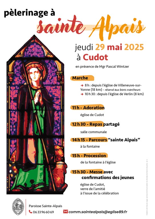 - Se déplacer, prier, célébrer l'Ascension de Notre Seigneur et se rassembler autour des jeunes confirmands Rappel du programme : départ de la marche à 8h00 précises devant l’église de Villeneuve réservé aux bons marcheurs Puis à 10h30 à Verlin Pour ceux qui ne marchent pas : Adoration à l’église Cudot à 11h 00 Repas partagé à 12h 30 à la salle de Cudot . Venir avec des plats à partager ne pas oublier son assiette et ses couverts 14h 15 parcours Ste Alpais à la fontaine 15h00 départ de la procession 15h 30 messe présidée par Mgr Wintzer avec la confirmation des jeunes suivie du verre de l’amitié. Nous comptons sur vous tous.