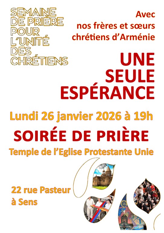 Une seule rencontre pour le Nord de l'Yonne, préparée par les groupes oécuméniques du sénonais et du jovinien, au Temple réformé, rue Pasteur à Sens, le lundi 26 janvier, à 19h.