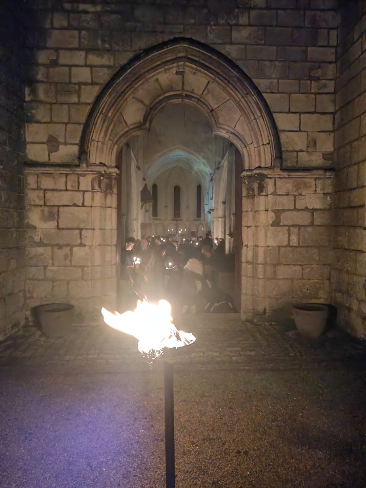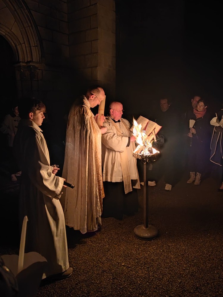 Le temps le permettant, le feu nouveau a pu être allumé sur le parvis. La coupure de l’éclairage publique rendait la lumière du feu encore plus désirée et rayonnante.