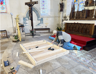 Commença rapidement le travail de construction d’une estrade pour recevoir l’orgue. M. Pierre Thomas, avec le père Dominique-Marie, s’engagea pendant deux jours dans l’église de Vincelles. Pas facile de stabiliser une estrade sur les dalles de hauteur et de pente bien différentes ! Après trois couches de traitement hydrofuge l’estrade fut finalement installée.