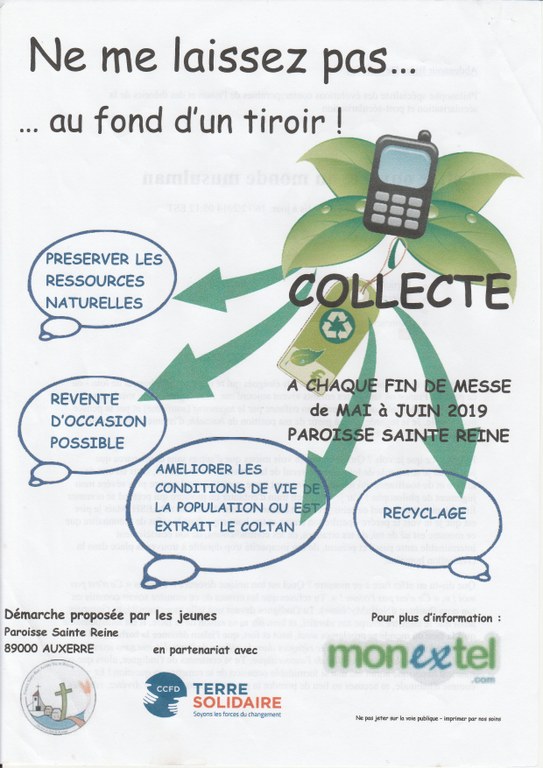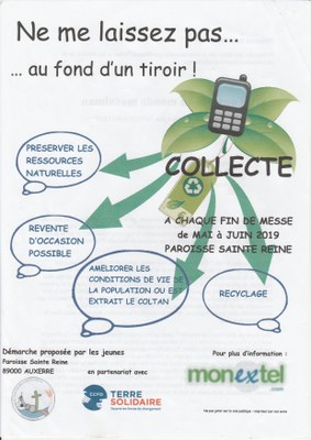 Avec tous les jeunes de la Paroisse Ste Reine, en lien avec le CCFD- Terre solidaire, nous vous proposons de collecter vos vieux téléphones portables, quel que soit leur état.