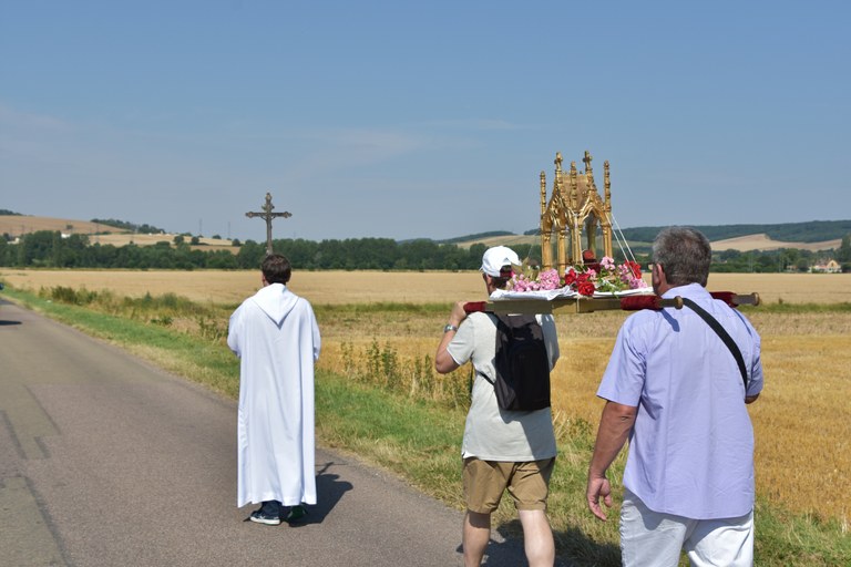 Le 1er juillet dernier, une cinquantaine de personnes se sont rassemblées à la Fontaine d'Azon, où le Père Tendeng a rendu mémoire au martyre de Sainte-Colombe. A la suite du reliquaire, la marche méditative et de prière a mené les pélerins jusqu'à la chapelle de Sainte-Colombe où avait lieu la messe regroupant les paroisses Sainte-Colombe, Saint-Bond et Saint-Savinien. En présence d'une assemblée nombreuse, le Père Tendeng était accompagné des Pères Morel et Brotowski, ainsi que des diacres Alain Kitten et Marcel Giamberardino. En fin de messe, Bernard Brousse - vice-président - a présenté le rôle de l'association des Amis de la chapelle de Sainte-Colombe-lès-Sens. Après le verre de l'amitié sous les arbres du parc, tous se sont retrouvés dans la salle à manger du lycée professionnel pour un repas partagé. L'après-midi nous a réunis dans la crypte (rénovée récemment par la commune de St Denis-lès-Sens) pour entendre l'histoire de Sainte-Colombe et des lieux, puis partager un temps de prière autour des reliques de la Sainte.