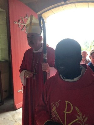 Puis, en la chapelle, nous continuions à rester des « Pèlerins d’Espérance » et vivions la messe de la fête d’été de Sainte-Colombe sous la présidence de Monseigneur l’Archevêque Pascal Wintzer. Son homélie sur le « Livre du prophète Isaïe » fut très appréciée et alimentait nos discussions lors du pot de l’amitié offert par les Amis de la Chapelle et son président Hubert Leprêtre. Nous restions sur le bas de la chapelle pour un repas partagé tiré du panier ; Monseigneur échangea avec quelques-uns, félicitant notre guide spirituel, notre père Benoît, toujours solaire.