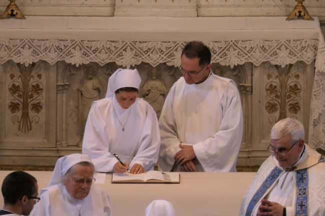 Et devant Mère Madeleine et Père Bernard, qui dirigent ensemble la communauté, les professes prononcent chacune leur engagement de se consacrer à la gloire de Dieu dans la famille Missionnaire de Notre-Dame. Puis Sœur Colombe signe les registres de sa communauté.