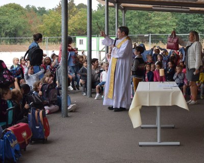 En cette matinée du jeudi 13 septembre, Mme Serré - directrice de l’école Sainte-Paule - a réuni tous les enfants, accompagnés de leurs enseignantes et ASEM ainsi que les parents, pour la célébration de la bénédiction des cartables.