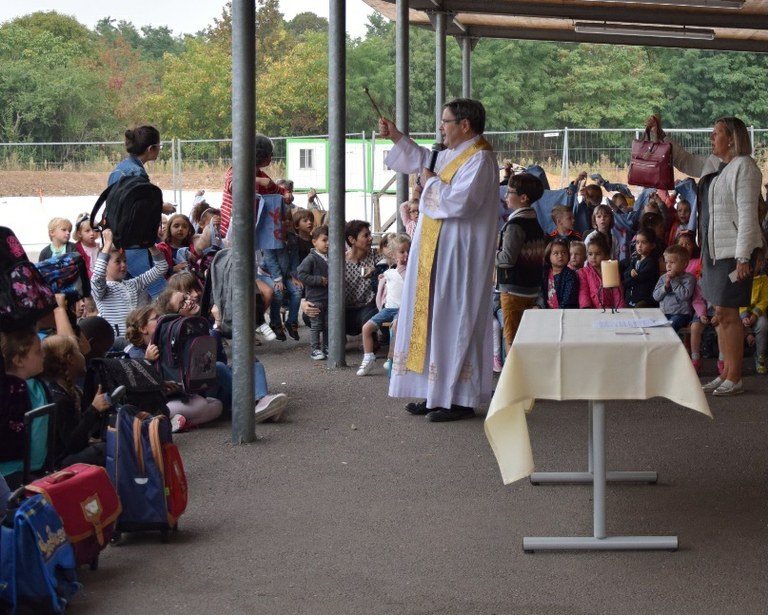 "A l’école, nous apprenons la lecture, les maths, le sport etc…, mais aussi à aimer et s’aider mutuellement. Les récréations permettent de jouer et de faire de belles rencontres. Pour tout ceci, nous avons des cahiers, des livres, des trousses rangés dans nos cartables. Pourquoi bénir nos cartables ? Parce que nous voulons que le Seigneur nous accompagne et nous guide toute l’année, qu’Il soit présent dans ce cartable".