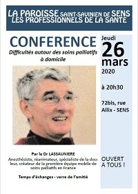 - Le Groupe Saint-Luc des professionnels de la Santé vous invite à une conférence et un temps d'échanges sur les "Difficultés autour des soins palliatifs à domicile", avec le Dr Lassaunière. Cette rencontre est ouverte à tous et sera suivie d'un verre de l'amitié.