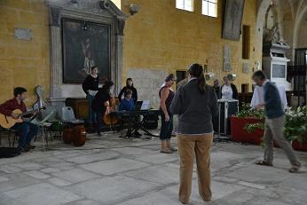Les musiciens prenaient le relais en installant leur matériel, en accordant leurs "violons"... ou plutôt un clavier, une guitare, deux violoncelles et la voix d'une jeune chantre de 14 ans... Pendant que l'équipe d'art floral installait ses compositions...