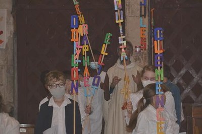 Les Jeunes avaient mis en couleur leur prénom de baptême. Car c'est vers une communion que le baptême nous ouvre le chemin. Après leur appel, le "bouquet de prénoms" éclairait toute l'assemblée et nous rassemblait autour des jeunes et leurs familles.