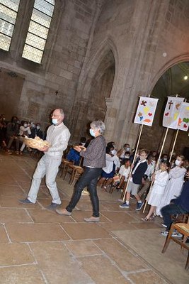 Alors nous étions prêts pour entrer dans la deuxième partie de la messe: la mémoire du sacrifice de Jésus , en commençant par l'offrande... du pain. (fabriqué par les jeunes) ... et de ces bannières à la gloire de l'eucharistie... emmenées en procession...