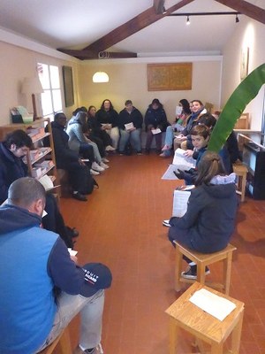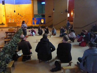 Après une repas frugal et simple… - un bol, une cuillère, des haricots-pommes de terre… et une tranche de fromage rudimentaire, ainsi qu’une pomme - , nous dirigeons nos pas vers l’église pour une répétition de chants, afin de mieux goûter l’esprit de Taizé… nous imprégner et repartir avec quelques refrains dans le cœur…, faisant l’expérience que c’est possible de chanter à 4 voix, dans diverses langues et de prier.