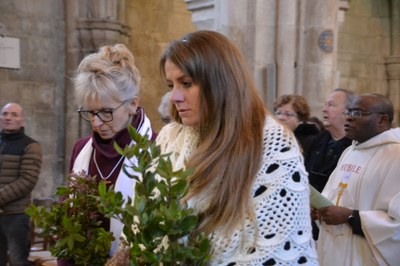 Les néophytes, avec l’écharpe blanche de leur baptême, ont fait la procession d’entrée avec les célébrants. Ils ont apporté des jeunes pousses et des feuillages qu’ils ont déposer au pied de l’autel.