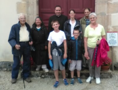 Après la messe, beaucoup se sont attardés pour échanger quelques nouvelles devant l'église... Un petit groupe a partagé un repas tiré du sac dans la salle communale, mise gracieusement à notre disposition (merci à la municipalité!) avant de commencer une marche priante vers Jully. Nous chantons ''Magnificat'' avant de nous élancer avec joie pour quelques efforts sous un ciel incertain. Avec Marie dans son cœur, le pèlerin ne recule devant rien !