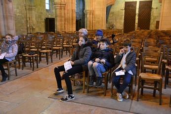 A 09H30 les Jeunes étaient bien là, malgré le froid relatif, pour découvrir l'Evangile du dimanche, par sa lecture, une animation ludique et une vidéo... avant de construire leur panneau de célébration.