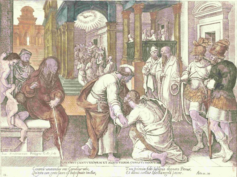 [Pierre] fit son entrée à Césarée. Corneille vint à sa rencontre, et se prosterna. Mais Pierre le releva et lui dit : « Reste debout. Je ne suis qu’un homme, moi aussi. » (Apôtres, 10, 24-26) [P. Galle, 1582, Gravure Bibiliothèque Royale de Belgique]