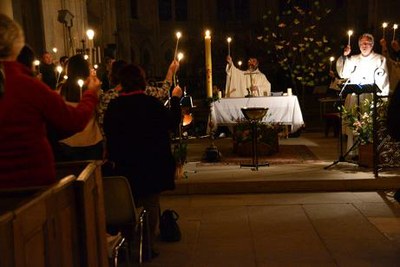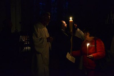 Le cierge pascal est alors allumé et nous suivons sa flamme fragile mais têtue
