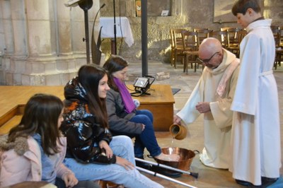 Il n’y a pas que mon cœur qui se fait beau ; il y a aussi l’église Notre Dame qui a besoin d’un bon coup de propre ! Après mon travail à la gare, j’aide au nettoyage. Tout va être prêt pour la célébration du Jeudi Saint. Je peux participer au geste du lavement des pieds (pas encore à l’Eucharistie.) Jésus me rejoint à ce moment où il a pris la tenue de serviteur.