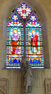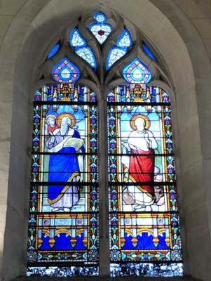 En regardant vers l'est lorsque l'on est dans le chœur de l'église, les Évangélistes vous font face sur quatre vitraux de 2,75 mètres chacun. Saint Matthieu et Saint Marc sont sur votre gauche et Saint Luc et Saint Jean sont sur la droite. Devant eux, on peut voir la statue de Sainte Jeanne d’Arc.