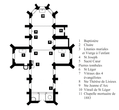 Après la guerre, il fallut plusieurs années pour réunir les fonds nécessaires et ce n'est qu'en 1957 que la restauration des vitraux fut confiée aux ateliers crées à Chartres en 1946 par Gabriel Loire. Les travaux inclurent la création de vitraux comme celui de Saint-Léger marqué avec le numéro 10 sur le plan ci-dessous...