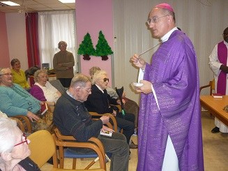 A 15H00, messe à la maison de retraite de Noyers, une trentaine de résidents ont assisté avec recueillement et quelques uns ont pu s’entretenir avec le Père Évêque à l’issue.